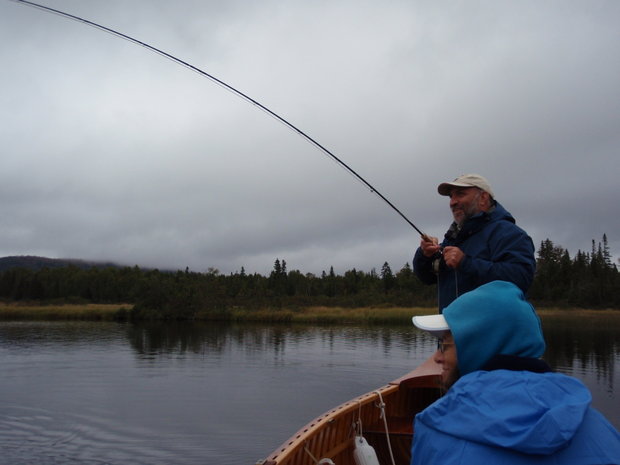 After lunch at my camp (asperagus soup, BLT's, lemonade, and chocolate cake...made by my wife...NOT me), we headed out on the lake in my canoe to see what we could stir up. They tried out several dry flies and brought in a few small trout using the Renegade, but later on the Marabou Black Ghost became the "go to" fly of the day.