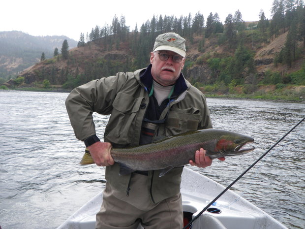 Day three, PNW weather with some rain thrown in and even colder than the previous day. We drift from the dam starting at seven am, our plan to be off the water at five and eat dinner at a normal time. I get the first hit and pull the fly right out of the steelies mouth, trout fishing habits are hard to break. The guide beaches the boat and had us wade down through two channels of the river. Cast and step and cast, I take time to look around at the hills that surround us as we fish our way down the run. About half way down the run I hook into a nice fish that makes several good runs, two of which take me into my backing before I bring him to hand. Before the end of the day, I land two and Mike lands two with his second one coming about two hundred yards from the take out, it's four fifty five and he hooks into a nice buck. So much for being off the water at five o'clock. I get one more on in the same run and loose it before we head for the take out.