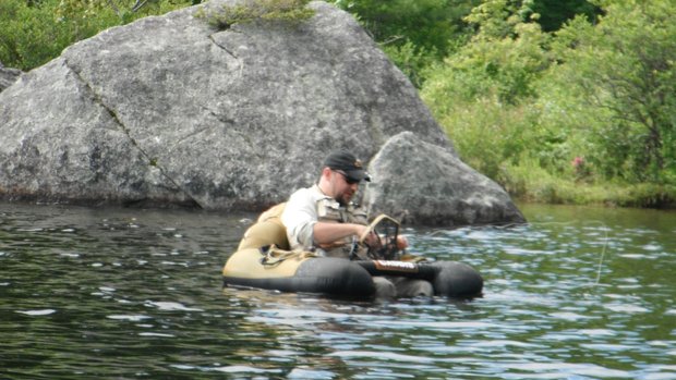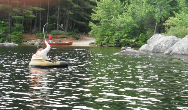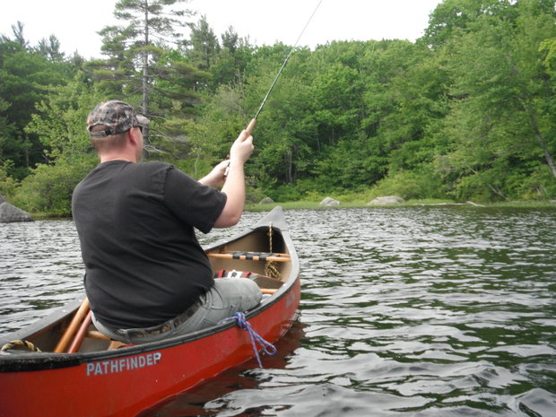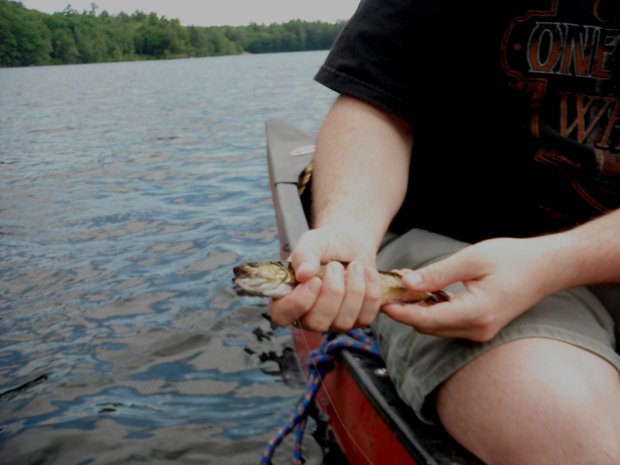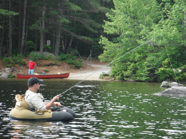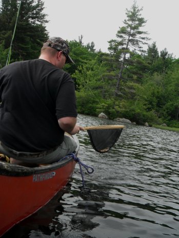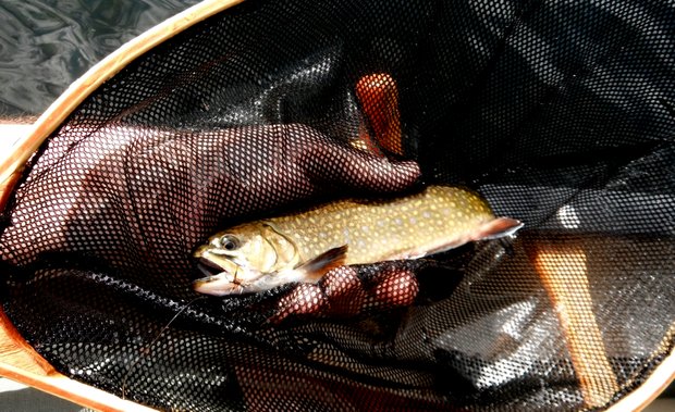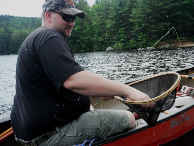 The day started with TBone getting lost on his way to my place but after a few calls we were finally off to Willard Pond. We dropped off the canoe and float tube at the water’s edge and I parked the truck.   By the time I made the walk back to the drop off, TBone had the first fish in the boat, a nice little brookie. (Goal #1 complete)