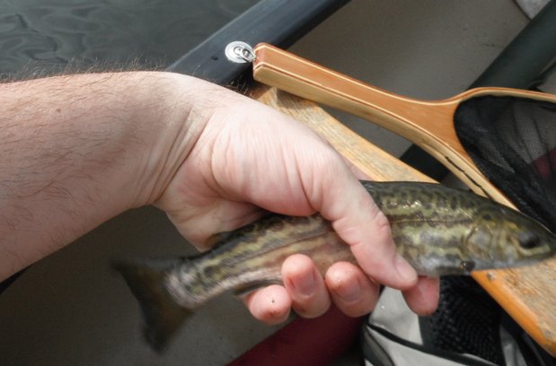 I watched schools of trout swim by the canoe all morning, and I would drop my dry fly and when it sunk strip it back, hits almost every cast.  Splashes would show up chasing my fly until about 5 feet from the canoe.  It was phenomenal!  Best day of fly fishing I've had yet, hands down!  I have caught bigger fish and I had a "Crappie day" with Ziggy that was awesome, but to hammer trout like that was one hell of an experience!