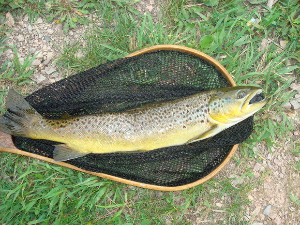 Ok caught on a 4wt Gatti rod , Lamson 1.5 oz reel  with Rio floating line 9 ft leader and Orvis 5X tippit . Size 16 Tiemco hook . Fly Pattern was a PMD . The temp was 91 with over cast skies and thunder in the back ground . Slight breeze rougly 15 mph. Water temps not sure . I believe from feel about 60 . The fight was a bit sluggish at first . He did manage to go over the lower dam and me following sliding down on my butt was funny to someone who might of been watching. I have to say it was skill but really I slipped. I released the fish after a quick photo in the creek below the dam.  I did not want to put him back in the spillway pool because they are going to drain it later this year to replace the dam . Thus killing the fish instead of saving them. That is a whole other story. But myself  the local fly shop and my friend Jay plan on releasing them down stream before that happens.