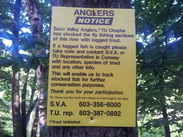 friend and i headed up early this morn to n. Conway area to hit saco, ellis and swift,we arrived the saco just as the sun was over the trees and walked down trail about 1/2 mile to our 1st location it as a beautful morning , we fished a few sections and wasn't long before Kenny yelled fish on nice little rainbow , i fished pockets and runs below him and soon was on my own nice rainbow . we fished hard with many hits and misses and kenny hooked up again and quickly got wraped up under tree and a " float hatch" had hapened LOL, Kennys description of all the floaters that use the river. a women went right under his line between him and the fish an it was gone, we spotted many nice browns crusing but none were interested in what we had to offer ,we decided to go back for a packed lunch that kenny had packed for us was some good sandwhiches turkey and ham with all the fixns, after lunch we decided to go hit a section of the ellis where we picked up some nice little brook trout , spent couple hours, nice little river , was beautiful area. once we left there we went exploring and hit the swift where it dumps into the saco and i was on a fall fish, water was way too warm for trout , walked down to saco and fished it for a little while with no results . decide to try a couple of places in the tamworth area water was too low so we called a night early and headed home , was a great day on new to me water had a blast look forward to some more trips soon, Pittsburg next wednesday til we get sick of it and come home Enjoy the pics.