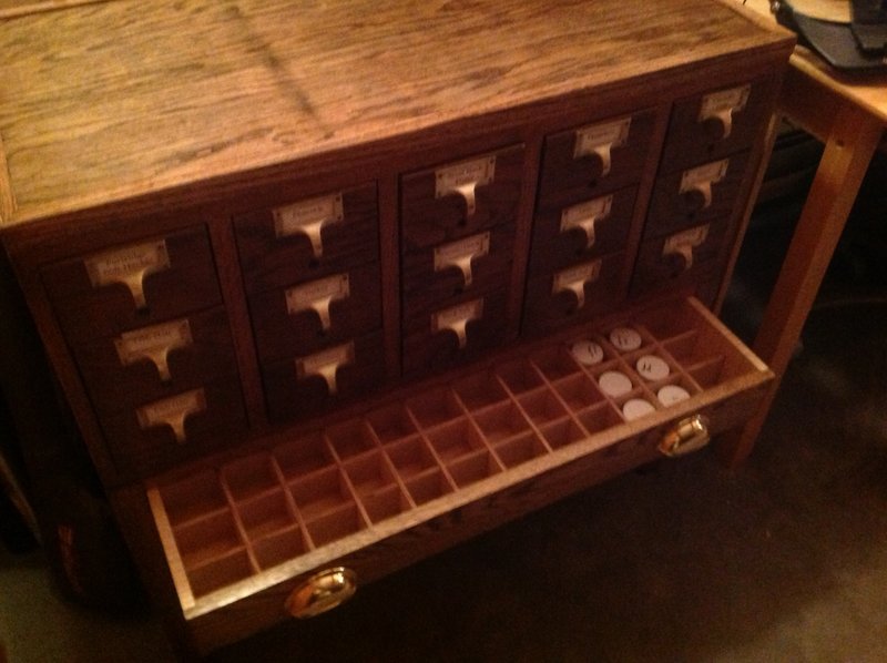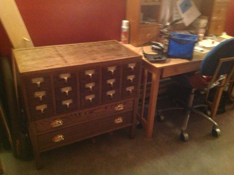 first thing I did was commandeer the daughter's old desk, but now the plastic bins just don't look right. So I found an old card catalog on Craigslist, built a top and base for it and now I have tons of work and storage space for tying.