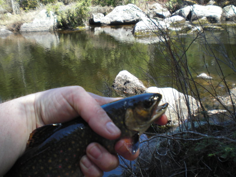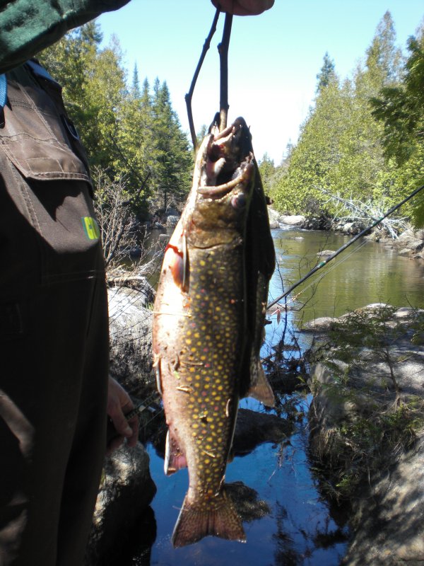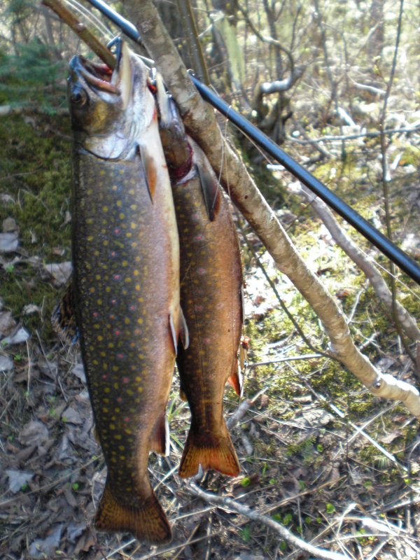 Ok, Ok I can't take the stress, I din't catch that big one it was another fella who was on the river.  The other pan size trout pictures were the ones that I caught.  Yes those would be wild trout as we don't have many stocked places in NB. Thats a pretty wild remote stream and it sure knocked the steam out of me hiking along it or more prescisely crawling over rocks, roots, fallen trees etc.   On Sunday I went out in the boat to try for LLS in Big oromocto lake but only managed to catch 5 bass and a pickerel.