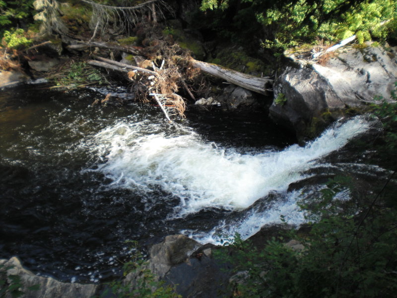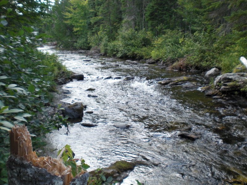 Squirrel Falls, 13 Aug, NB Crown Reserve.   What a treat to actually drive right to the Crown Reserve Cabin and not have to lug any gear in. Camp was a nice one with only a minor bear problem, when the windows all have bars on them and the door is solid hardwood three inches thick, well lets just say your safe and secure sleeping at night. Squirrel Falls is located on the North Branch of the Sevogle river which is a tributary of the Northwest Miramichi. Good numbers of grilse and salmon in most pools, walking was very rugged with a long staircase leading down to the river. Fished from Friday to Sunday, with the highlight being a 31 inch salmon landed on Sunday around noon, proving that persistence pays off as our timing ended at 2PM. Upper pools can be accessed by a six km four wheeler trip, lower pools being closer to the cabin were only about a 1 km bike trip then you walk in. Let me tell you that Squirrel falls pool is one heck of a hike down river and not for the faint of heart. Bear tracks at numerous locations along the river kept one focused and alert. Had one uninvited visitor in the afternoon when we were away. I had made the mistake of leaving a tin can with some bacon grease in it on the front deck. When we returned the coleman stove was flipped over and the grease can was crushed with bite marks in it. So I promptly accused my long time fishing buddy of pulling a little trick on us. You know he probably stepped on the can and used a hammer and nail to punch a few holes in it, then threw it on the ground. Any way after a couple hours of him professing his innocence I came to the conclusion that one hell of a big critter gave us a visit and we missed it. Sat outside till the wee hours of the morning both nights and put away a few too many. Had an excellent trip.