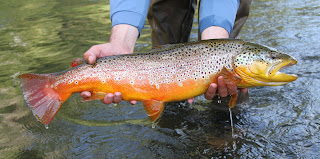 Whats amazing is the color and size of the Brown . The stream isn't all that big from which it was caught and released . I am so glad that the Browns are making a recovery . The problem with poachers and Didimo almost wiped out the large fish and the wild population of Browns. Not to mention a 10 year drought. With the higher water and rain this spring has improved our fishery immensely. I am looking fwd to the weekend. I might get to fish for some wild Brookies . I might have to rent a vehicle to do it but I have to wet a line I am going crazy.