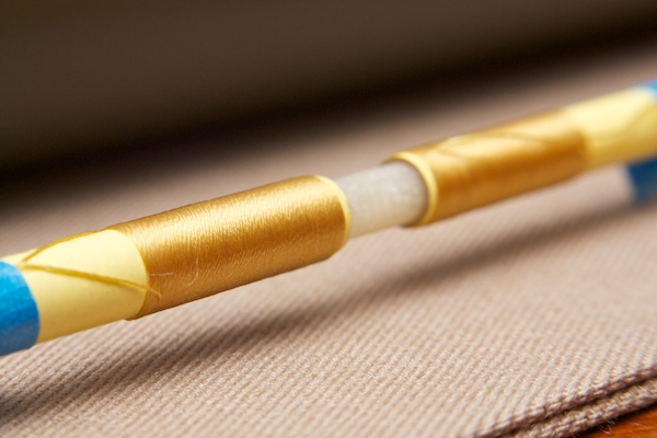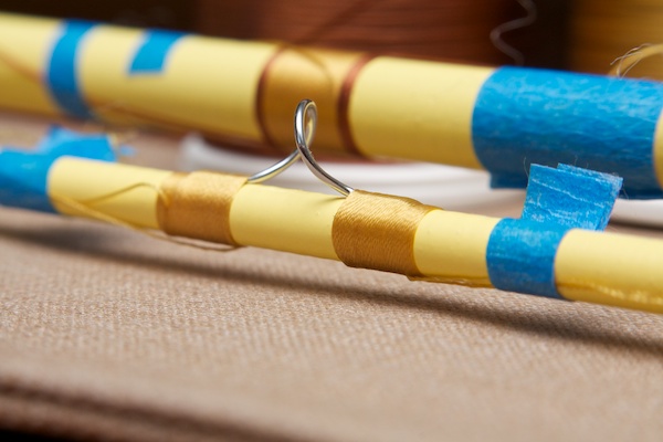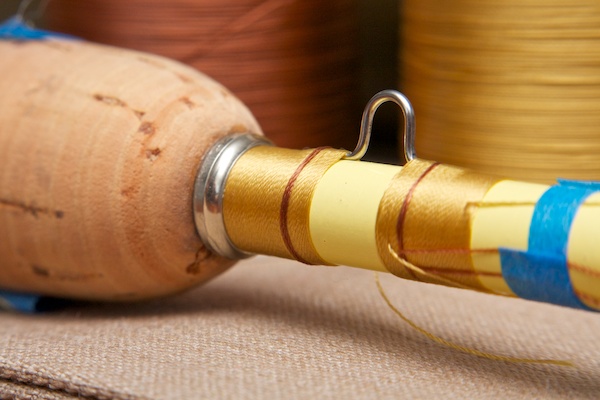 Here are some teaser pictures for the rod build. I've got the wraps just about done. Still waiting on a backordered rod dryer that should get to me mid next week. If you can look past the loose threads and masking tape you can see where I decided to go with this. Only thing left to add is some tipping on the ferrule wraps. In case you're wondering, I've left the tag ends of thread that way I can do some last minute tightening prior to adding color preserver and thread finish. I'll tighten and then trim them back just before finishing.