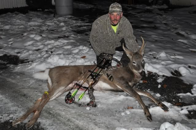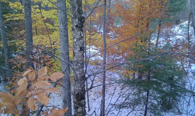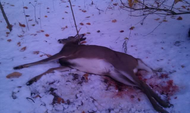 Oct. 30th sunday morn i decided to sleep in some and make the family breakfast and do some stuff around the house, about 8 am i sneak out back to sit for a couple of hours wind blowing and snow falling off the trees all around me not a real fun couple of hours i decide to head home and hang with the wife and daughter .