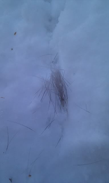 To say i was less then impressed with my chances,would be an understatement , i figure i now had the challenge of getting my body in position and still have to grab my bow on same side of tree as the deer , i watched him closley and made very subtle movemenets to get my feet lined up and ready then i grabbed my bow ever so slowly and clip on my release by now i swear he can hear my heart throbbing LOL . Now its his move i only have one shot and he has to walk into the lane sure enough he takes a step towards it and i realize this may happen , i draw my bow and hold, (for like a year ) prob only about a min or so , 2 more steps is all i need and sure enough he walks right into the lane and stops like it was rehearsed, i settle the pin just behind his last rib slightly quartering towards me , and i thought he was more Quartering away, i let it fly, " loud pop" is all i hear and he springs off and is out of sight in a second or 2 .... now the shakes and going over shot in the head starts, i was just getting a text from my wife about dinner and didn't want to let the cat out of the bag until i knew for sure i had a good hit . i ignored her and looked down at the clock wow i thought all that just happened in under 7 min and it seemed like an hour. i was excited to get down to see what i could find for some sign i waited 15 min or so and climbed down and walked to where the deer was standing hmmm see his tracks no blood i look closer to find a pile of hair good sight i follow tracks to edge of clearing and find what i was looking for .... see below