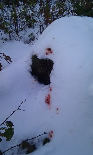 We head a little further to see the tail of a deer run off i figured by now this is him and we back out , we went home and decided to give him a couple of hours not knowing exactly where the shot was and that he already laid down and we jumped him told me he was hurt pretty bad, we headed back to the house and had dinner and decided to grab the lights and head out once more to see if i could recover him , my daughter and i spent 1.5 hours walking slowly from spot to spot of blood trying to be quiet just incase he was bedded down and wanted to jump up, we followed his track to my neighbors driveways and decided to wait until morn to go further , we had good blood in a bed we found and i knew he would be long for this world , i hate leaving them with all the dogs in the woods now adays but it worked out to be a great decision . i got up early the next morn and went out at 1st light talked to my neighbor to let them know why i was walking around there driveway . i quickly located his track and small amount of blood and followed him to find him about 30 Yrds from where we left off .
