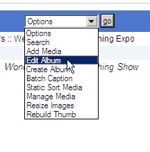 In the album view screen (you must be viewing the album you wish to edit), this is where you select to Edit an existing album. The edit screen is identical to the create screen and allows you to modify the settings of an album and also change the parent album (effectively moving the album to another parent).