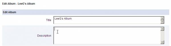 Select Edit AlbumAfter you press the Agree button you are taken to your blank Album. The Default Name of the Album is your Handle name plus the word Album. So for user LeeG his default Album name would be LeeG's Album. Now lets add a Description to the Album.