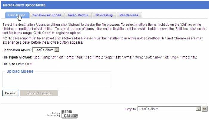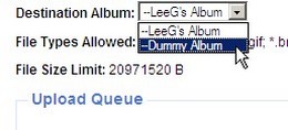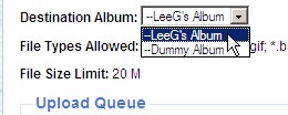 Add MediaUploading Photo's to your Album is a very easy process. Use the Options drop down menu and select Add Media to upload photo's from your computer to the web site. You will have several options on the upload screen to use for uploading Photo's. We are going to use the Flash option in this discussion. When you first go into the Flash screen you will see a file size limit shown in the lower left side of the screen. This number is critical to the success of the upload. If it is a long string of numbers you will need to change to another album to make this number be 20M. Then change back to the album you intend the new photo's to go into. If you do not have a sub album to change to, then you should use the Dummy Album I have setup for this purpose. Make sure you change back to the album you want the photo's to go into. Here is an example of a bad file size limit. Bad File Size Limit
